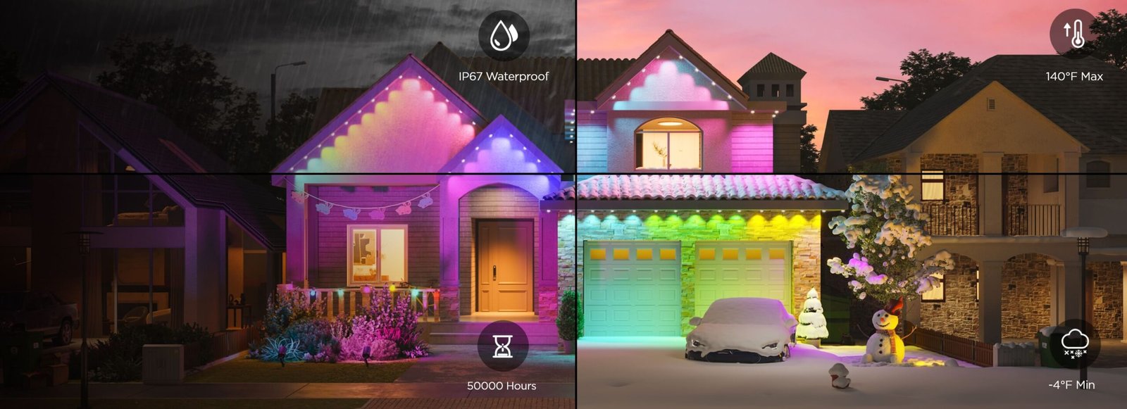Designed to withstand harsh outdoor conditions, Govee permanent outdoor lights feature IP67 waterproof ratings and anti-UV materials. This professional-grade durability ensures your lighting continues to perform beautifully through rainstorms, snow, and intense summer heat. Many models can operate in temperatures ranging from -4°F to 140°F (-20°C to 60°C), making them suitable for virtually any climate.